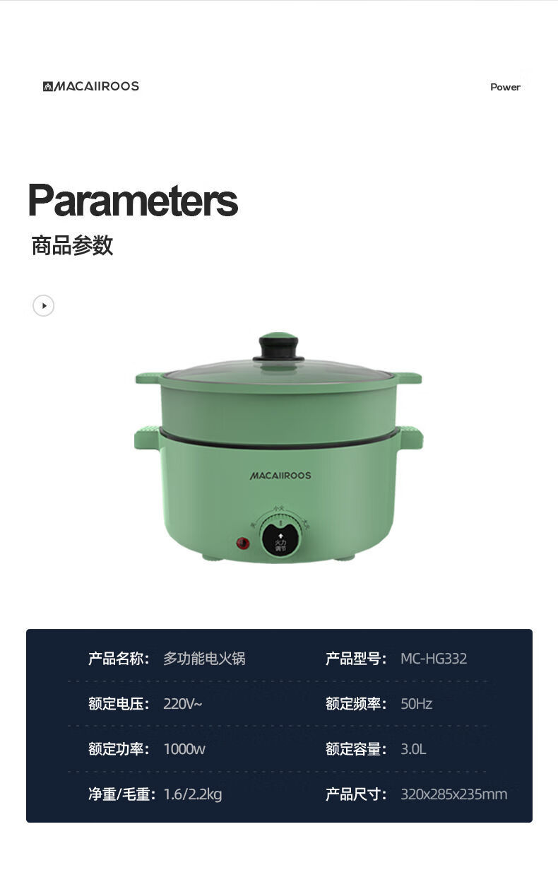 商品名称:迈卡罗电煮锅火锅家用多功能电锅 MC-HG332(带蒸笼)