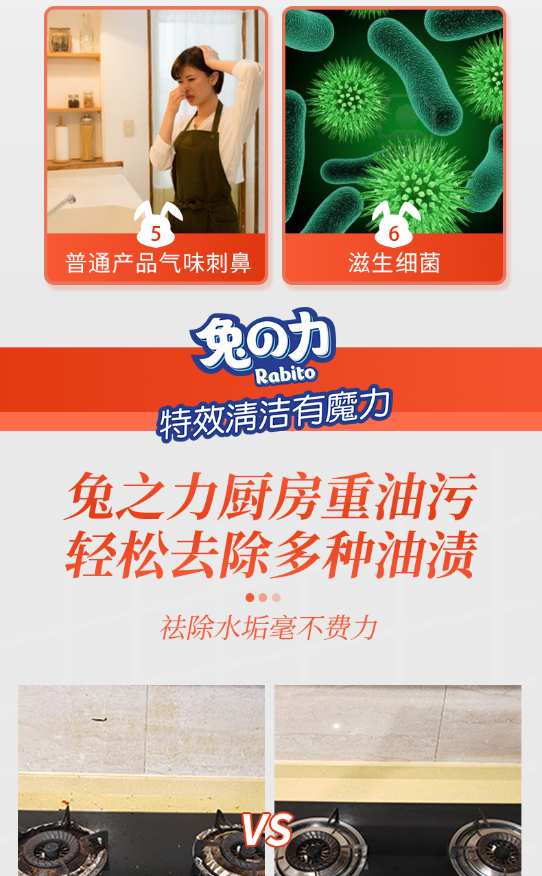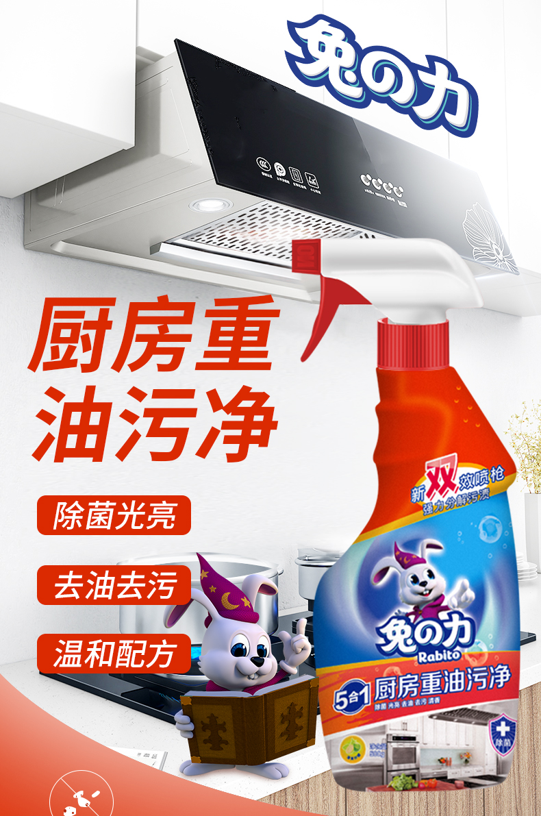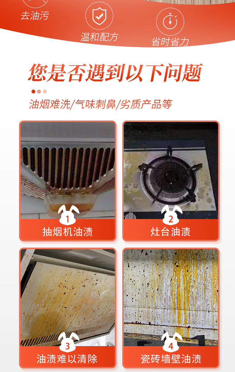 商品名称:兔の力油污清洁剂 500g 5合1厨房重油污净 油烟机灶台去油污清洁剂 500g 2瓶 瓷砖清洁剂*1瓶